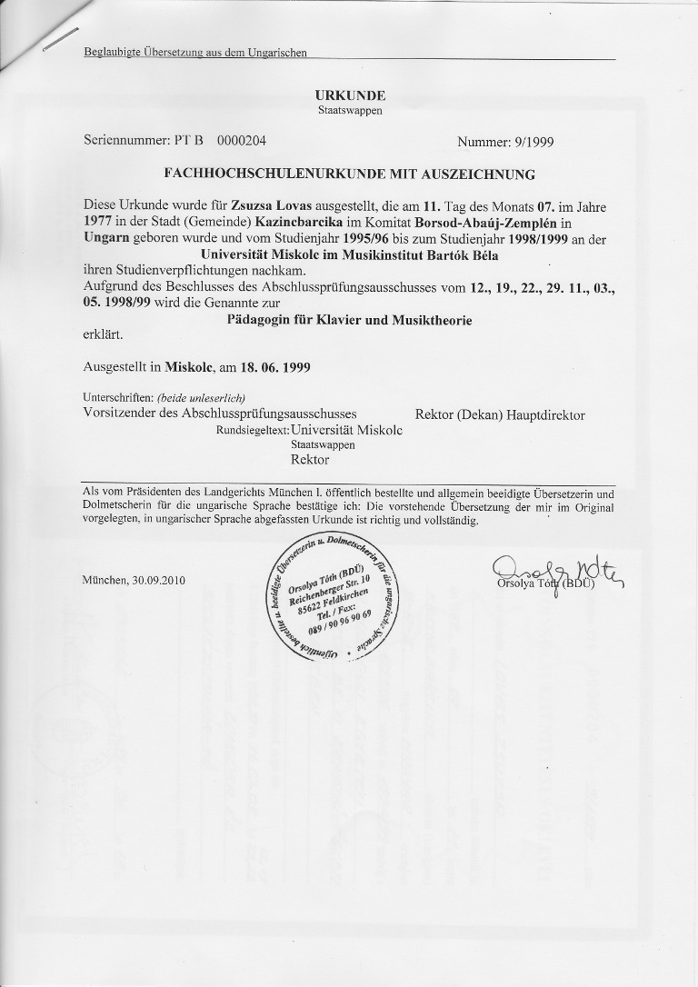 | 1995 - 1999 | Universität Miskolc - Béla Bartók Musikkünstlerisches Institute, Miskolc (Ungarn), Diplom als Lehrerin für Klavier und Musiktheorie |